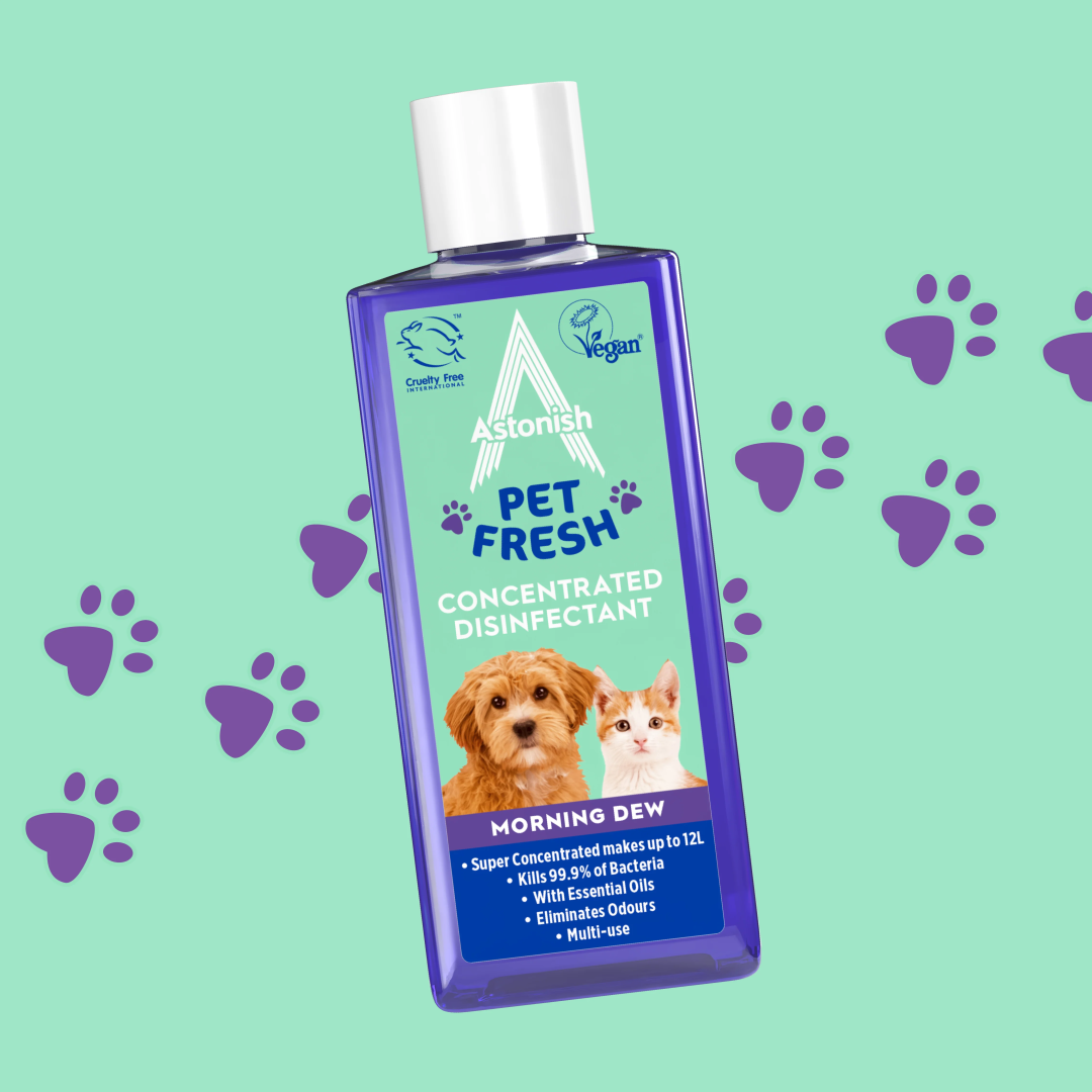 Концентрований дезінфікуючий засіб без хлору Astonish PET FRESH нейтралізує запахи від домашніх тварин та вбиває 99,9% бактерій і вірусів з оболонкою, включаючи коронавірус.